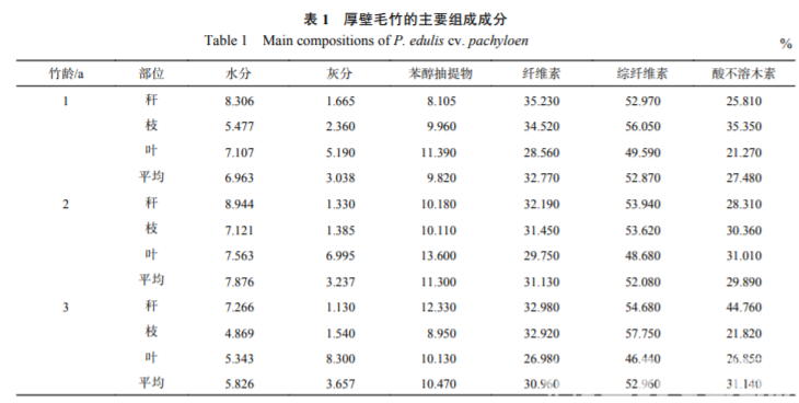 竹材是速生型植物資源,具有生長快、易繁 殖、產(chǎn)量高、再生能力強(qiáng)等特點(diǎn),通過合理間 伐,可永續(xù)利用,是理想的代木材料。厚壁毛竹 ( Phyllostachys edulis cv. pachyloen) 是 20 世 紀(jì) 80 年代發(fā)現(xiàn)的一種毛竹變種,其稈略呈四方 形,稈壁率是毛竹的 2.0 倍,胸徑部位絕對(duì)厚度 可達(dá) 2.5 cm 以上,是等徑毛竹的 1.8 倍,出材率 比一般的毛竹要高,具有較高的研究和應(yīng)用價(jià) 值。目前,厚壁毛竹在生物質(zhì)能源及化學(xué)品等高 值化應(yīng)用尚處于起步階段,其化學(xué)成分的類別 和含量直接影響厚壁毛竹材性和利用價(jià)值,尤其 對(duì)人造板應(yīng)用和制漿造紙影響較大。有研究指 出,不同年份和不同部位厚壁毛竹的主要成分含 量具有較大的差異性。基于此,本研究以 1 年 生、2 年生、5 年生厚壁毛竹為對(duì)象,研究其中 稈、枝、葉部位不同部位化學(xué)成分類別和含量變 化規(guī)律,以期為厚壁毛竹的合理利用提供參考。