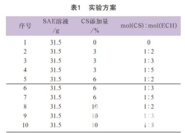 SAE溶液原液的固含量為31.75%,每次實驗均使 用絕干質量為10g的S A E,即溶液質量31.50g。分別配 制不同質量百分比的C S和不同摩爾質量比的E C H與 S A E反應制得改性施膠劑,C S質量均為S A E溶液絕干 質量的3%、6%、10%,C S與E C H的摩爾質量分數比分 別為1∶2、1∶3、1∶5。具體方案設計如表1所示。