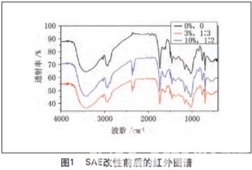 圖 1中 分 別 是 添 加 C S 量 為 0 % 、3 % 、1 0 % , 并且添加 E C H為 0、m o l (C S)∶m o l (E C H )=1∶2、 mol(CS)∶mol(ECH)=1∶3的紅外圖譜。無CS和ECH添 加的樣品,即改性前實驗室制備的S A E乳液。通過對比 分析,改性前后的聚合物紅外圖譜基本一致,即改性前 后的聚合物功能基團一致。C S中含有胺基(-N H2), S A E中含有叔胺,E C H作為交聯劑易與胺基(-N H2) 和叔胺發生交聯反應、季胺化反應,生成了叔胺和季銨 鹽。改性后的聚合物圖譜中沒有出現C S的-N H2振動 峰,環氧基團也不存在振動峰。圖譜結果基本能表明 CS、ECH都和基體SAE發生了交聯反應。 2.2 乳液的基本物性 改性后乳液固含量測定后,通過計算,使用蒸餾水 將所有乳液的固含量統一調制成為31.75%,對調制后 的乳液進行pH值、黏度檢測,結果如表2所示。 與原S A E相比,改性后表面施膠劑的p H值、黏度 稍有增加。這與聚合物改性引入胺基、生成叔胺和季 胺,生成網狀聚合物有關。結果表明改性后的乳液p H 值、黏度變化不顯著。