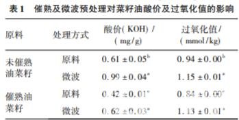 分別稱取未催熟及適當催熟的油菜籽 50 g,平 鋪于直徑為 9 cm 的玻璃平皿中。設定微波爐頻率 2 450 MHz、微波功率 800 W,對油菜籽微波處理 7 min 后,取出樣品自然冷卻至室溫。隨后投入低 溫壓榨機內(nèi)進行壓榨,收集菜籽油,于 8 000 r/min 下離心 15 min,清油封存于 4 ℃ 冰箱備用。同時將 未經(jīng)微波預處理的油菜籽直接低溫壓榨制備菜 籽油。