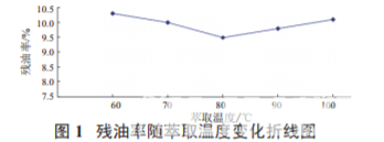 在料液比 10 ∶ 40(mL /mL)、抽提時(shí)間 8 h 的 條件下,由圖 1 可知:溫度升高可以提升油脂的萃 取率,降低殘油率。但當(dāng)溫度達(dá)到 80℃時(shí),殘油 率不再降低,這可能由于 80℃達(dá)到了蛋白質(zhì)變性 的臨界溫度,溫度繼續(xù)升高蛋白質(zhì)開(kāi)始變性,火麻 油不飽和脂肪酸氧化增加,分子增大,水溶性降低, 導(dǎo)致萃取率降低,故 80℃為較優(yōu)水平。