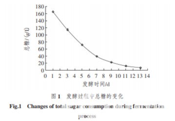 茶酒發酵過程中總糖的變化如圖 1。 從圖 1 可以知道,在發酵初期,由于酵母菌大量生長繁殖的需要,對糖的利用率很高,導致降糖速度非 ???。隨著發酵的進行,降糖速度變慢,主要是由于酒 精含量和酸度的不斷增加,均會在一定程度上影響釀 酒酵母的代謝活動能力,從而降低了糖的消耗速度。 直到總糖不再變化時,發酵也幾乎停止,到主發酵結 束時總糖含量為 7.5 g/L。