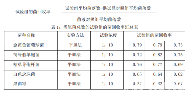 試驗組:分別按上述菌落計數方法進行試驗組菌落的計數。 菌液對照組:以稀釋液代替供試品溶液,按照試驗組的菌落計數方法試驗。 供試品對照組:按菌落計數方法,不加試驗菌,測定供試品本底菌落數。 陰性對照試驗:用刻度吸管吸取稀釋液 1ml 置直徑 90mm 的無菌平皿中,注入 15~20ml 熔化的胰酪大豆胨瓊脂培養(yǎng)基或沙氏葡萄糖瓊脂培養(yǎng)基,混勻,倒置培養(yǎng)。陰性對照試驗應 無菌生長。如果陰性對照有菌生長,應進行偏差調查。 培養(yǎng)條件:需氧菌總數計數方法適用性試驗時,金黃色葡萄球菌,銅綠假單胞菌,枯草 芽孢桿菌培養(yǎng)溫度為30~35℃,培養(yǎng)時間3~5天;白色念珠菌和黑曲霉培養(yǎng)溫度為30~35℃, 培養(yǎng)時間 5 天。霉菌和酵母菌總數計數方法適用性試驗時,白色念珠菌和黑曲霉培養(yǎng)溫度為 20~25℃,培養(yǎng)時間 5 天。結果見表 1,表 2。 結果判斷: