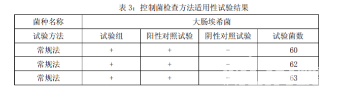 適用性試驗,霉菌和酵母菌總數計數方法適用性試驗和控制 菌檢查方法適用性試驗,分別要進行三次試驗。結果見表 3。