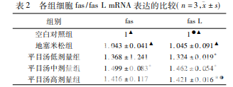 與空白 對照組相比,平目湯各組 fas、fas L 蛋白表達均上調,差異有 統計學意義( P < 0. 05) ,地塞米松組無統計學差異( P > 0. 05) 。在升高 fas 表達方面,平目湯高劑量組與平目湯中 劑量組、平目湯低劑量組比較,差異有統計學意義( P < 0. 05) 。平目湯中劑量組與平目湯低劑量組比較,無統計學 差異( P > 0. 05) 。