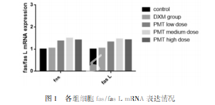 平目湯,由黃芪 30 g,淫羊藿 15 g,川芎 15 g,白芥子 15 g,炙鱉甲 15 g,車前子( 包煎) 30 g 組成,由 上海中醫藥大學附屬龍華醫院中藥房制備成水煎劑( 生藥 含量為 4 g /mL) ,4 ℃保存。 Trizol  Reagent,Life Technologies Corporation 公 司; DEPC( RNA 酶抑制劑) ,Sigma - Aldrich - Life Science 公 司; 無水乙醇、75% 乙醇、異丙醇、氯仿、十二烷基硫酸鈉 ( SDS) ,國藥集團化學試劑有限公司; 逆轉錄試劑盒( GoScripTM Reverse Transcription System) ,Promega 公司; 臺盼藍 染液、One cell 細胞計數板,上海魯汶生物科技有限公司; 引物合成,上海閃晶分子生物科技有限公司; Fas 抗體、Fas L 抗體,美國 abcam 公司; GAPDH 單克隆抗體,美國 CST 公 司; 辣根過氧化物酶標記的二抗,美國 Jackson ImmunoResearch 公司; 生理鹽水,上海長征富民金山制藥有限公司; Protein Marker ( PageRulerTMPlusPrestaind Protein) ,Thermo Fisher Scientific 公司; 蛋白酶抑制劑,Roche Diagnostics 公 司; 微量 BCA 蛋白定量試劑盒,康為世紀公司; 20% SDS solution、Tris - Hcl Buffer( pH 為 6. 8) 、40% 丙烯酰胺( 40% Acr) 、四甲基二乙胺( TEMED) ,BIO - RAD 公司; Tris - Hcl Buffer( pH8. 8) ,北京索萊寶( Solarbio) 科技有限公司; SDS - PAGE 上樣緩沖液( 5 × ) ,碧云天生物技術研究所; 甘氨 酸( MW75. 07) 、Tween 20,SIGMA - ALDRICH 公司; 氨基 丁三醇( Tris) ( MW121. 14) ,Sigma 公司; 硝酸纖維素膜 ( PVDF 膜) ,Millipore 公司; 麗春紅染色試劑,康為世紀公 司; 脫脂奶粉( 國產伊利牌) ,內蒙古伊利實業集團有限公 司; 顯影劑試劑盒( Immobilon Western 化學發光底物) ,Millipore 公司; 胎牛血清,Biowest; DMEM 培養基,上海立菲生 物技術有限公司( life technologise) 。基因序列通過 GenBank 獲得,由上海閃晶分子生物科技有限公司設計并合 成。引物序列見表 1。